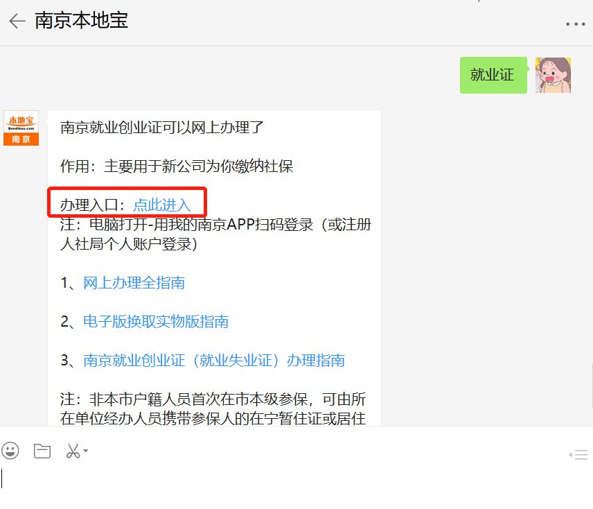 微信搜索公众号“南京本地宝”,关注南京本地宝微信号;对话框输入【就业证】即可一键获取南京市失业登记网上办理入口、办事指南等实用信息。