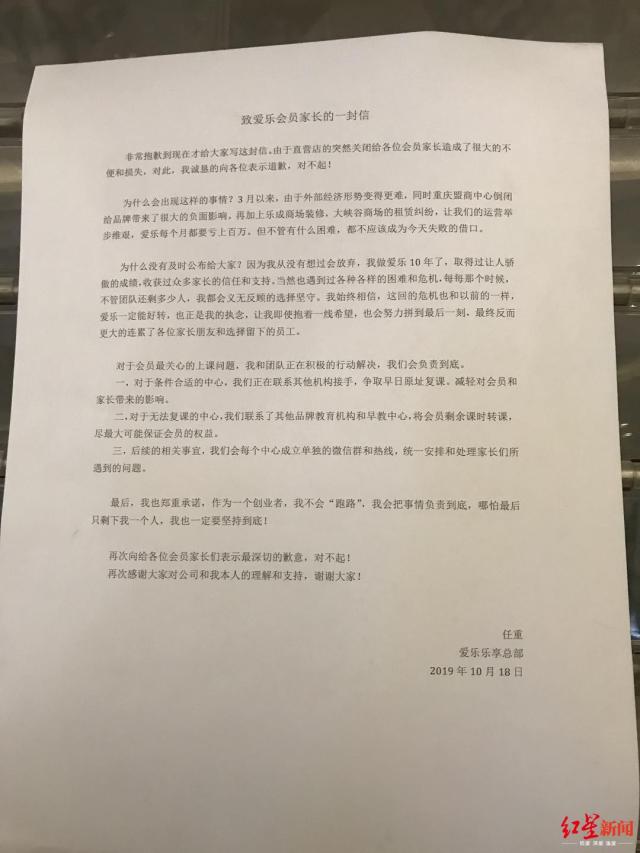 10月19日,爱乐乐享总部负责人任重发表了“致爱乐会员家长的一封信”,对“直营店的突然关闭给各位会员家长造成了很大的不便和损失”抱歉,并承诺自己不会“跑路”,会把事情负责到底。