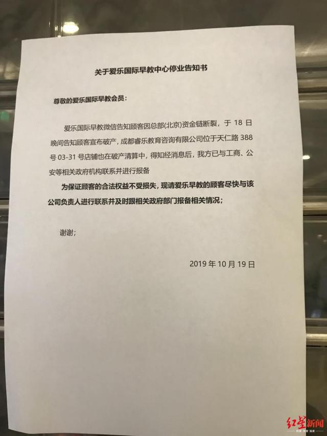 正是这张没有盖章、没有落款的告示,再度引发家长极度不满。该告示称,爱乐国际于18日晚间宣布破产,成都睿乐教育咨询有限公司位于天仁路388号03-31号店铺也在破产清算中。得知消息后,我方已与工商、公安等相关政府机构联系并报备。为保证顾客合法权益,请爱乐国际的顾客尽快与该公司负责人进行联系并及时跟相关政府部门报备相关情况(注:有删节)。