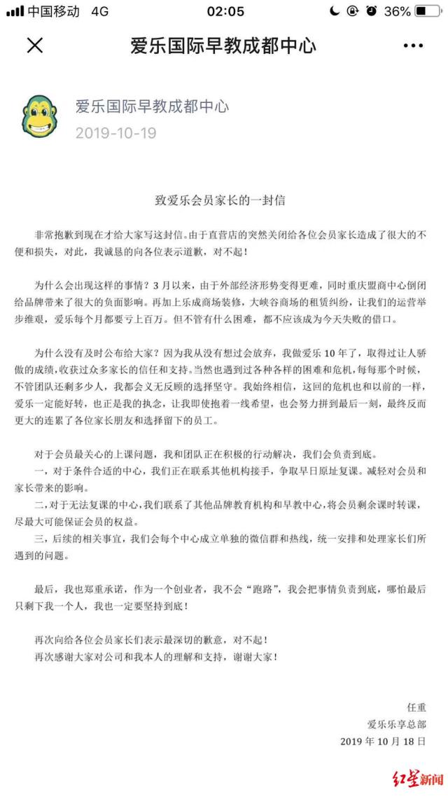 10月19日凌晨1点47分,爱乐国际早教成都中心官方微信公众号推送了“致爱乐会员家长的一封信”。信中,总部负责人任重对“直营店的突然关闭给各位会员家长造成了很大的不便和损失”表示抱歉。