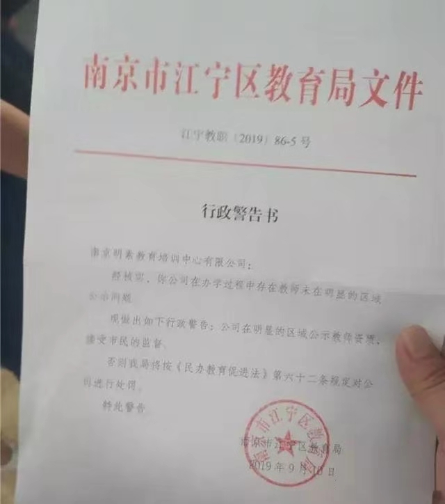 10号下午,教育部门联合相关部门进行了联合执法,并于11号下午进行了回头看。南京市江宁区教育局职社科科长陈纯忠表示:“应该从根本情况来看得到了纠正,比如这个教师信息原来是在里边,不方便老百姓查看,改到外边可以随时看到教师的资质。”