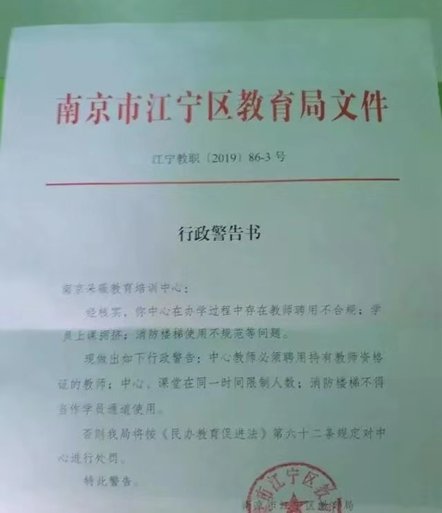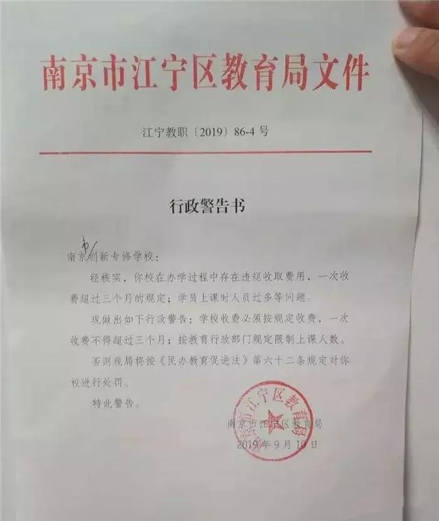 而在南京市创新专修学校,则存在在办学过程中用优惠方式变相超期收取费用、学员上课时人员过多等问题,执法人员当场下达了行政警告书,责令其立即整改。